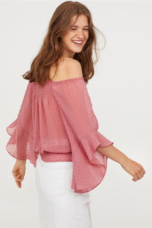 Шифоновая блузка с открытыми плечами и воланами воланами от шведского бренда H&M. Укороченная модель. На талии резиночки. Верх: плотный фактурный шифон, не тянется. Сток, без бирок. (4786) Размер: 36 Полуобхват груди: 50 см Полуобхват резинки: 33 см, тянется до 48 см Полуобхват горловины: 44 см, тянется до 72 см Длина руава: 46 см Состав: 100% полиэстер