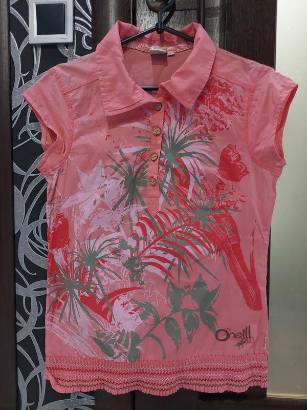 Летняя блуза, Футболка oneill в тропический принт с элементами вишивки кораллового цвета. На бирке размер Xs, подойдет на 42-44. По низу резинки. Состояние идеальное.