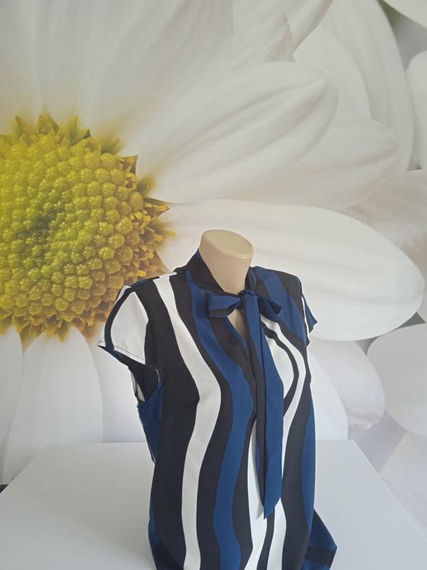 Классическая блузочка с коротким рукавом и оригинальным контрастным рисунком. Стильно сочетаются цвета. Легкая и удобная. Приятная на ощупь. Тонкая, но плотная ткань. Практически не тянется. Ложится свободно. Фасон прямой. Аккуратный вырез, украшен завязками. Есть размеры.
