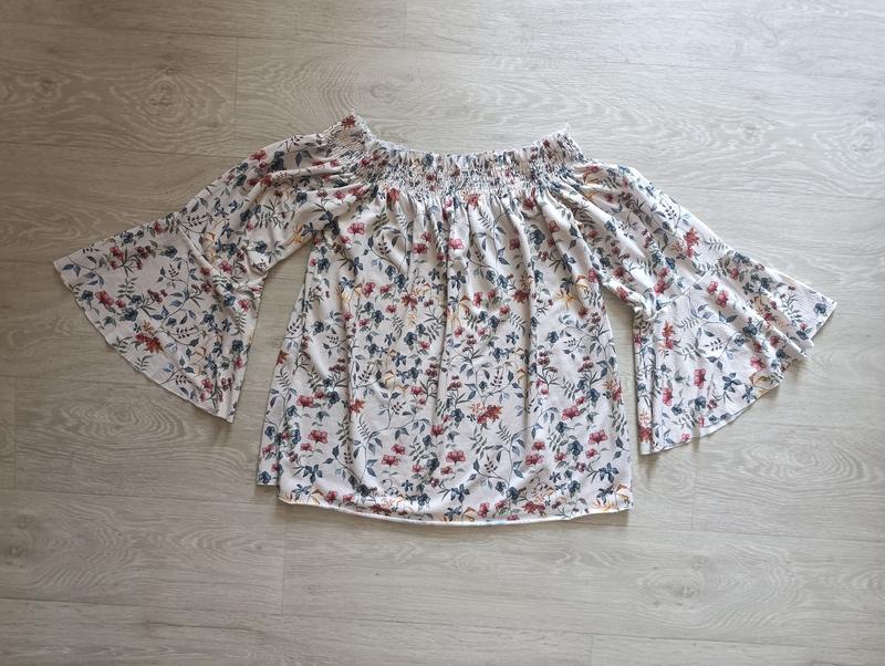 К 07.12 1+1=3 НА ВСЕ. Женская белая блуза в цветочек Pull & Bear со спущенными плечами, с рукавами-колоколышками, без нюансов, размер S-M: ПОГ - 40-50см Длина - 55см Длина рукава - 45см
