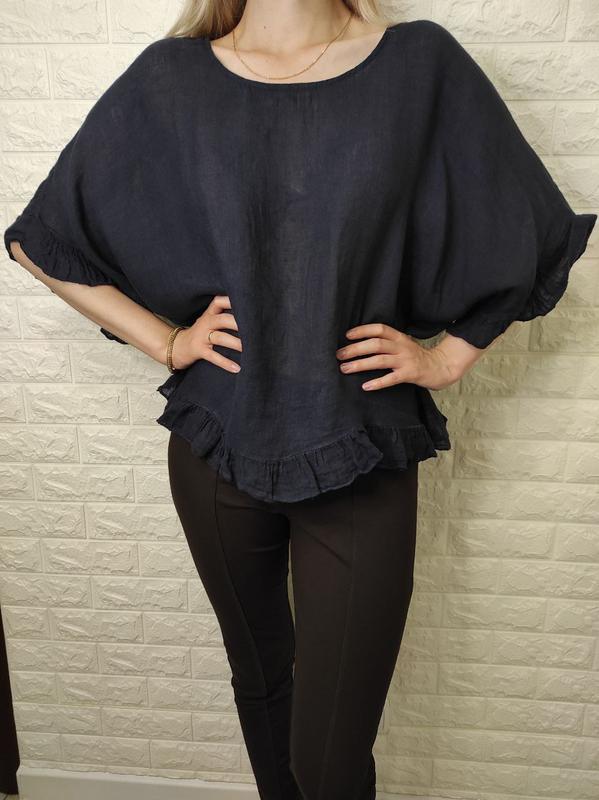 Блуза - красотка производства Италии в идеальном состоянии 🔥 Цвет: темно-синий. Склад: 100% тонкий льон. Тканина надлегка, дихаюча. Замеры: рукав реглан от ворота 42, ПОГ 70, длина 62/67. Идеальный вариант на лето 💔