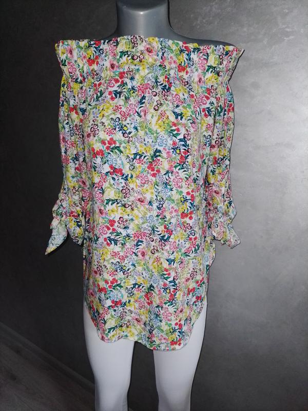 Натуральная, мастерьез не ношена, веселый, летний принт! Празднично подходит с белыми брюками, размер указан 36, но подойдетМ,С
