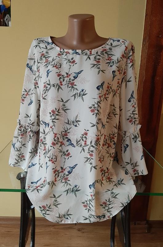 Блуза с красивым рукавом 3/4, красиво ложится по фигуре. Подойдет на размер 50-52 (украинский). Объем в груди 108 см, в бедрах 116 см. Длина по спинке 65 см. Длина рукава по верхнему сгибу 44 см.