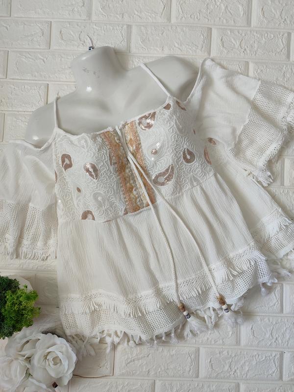 Блузка женская с вышивкой и кружевом,низ и рукава бахромой, плечи открытые, ткань тонкая, легкая, приятно к телу, коттон,еуланс,в носке не заметно, ценни учтены Замеры на фото