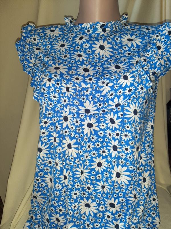 Блузочка яркая в ромашку с рюшами, размер UK 14; ПОГ - 52+ тянется до 65, ПОТ - 60+, длина - 70см