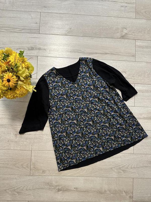 Хорошая блуза ручной работы, пошитая под заказ/ Подойдет на размер с м л европейский ориентируйтесь по замерам/ Длина 65-68 см/ Плечи 38 см/ Рукав 37-43 см/ Пог 52 см/ Пот 56 см/ Знизу 65 см/ Принтовая часть тянется,черная не тянется,плотность средняя/ В составе эластан коттон/ Продается без возврата/