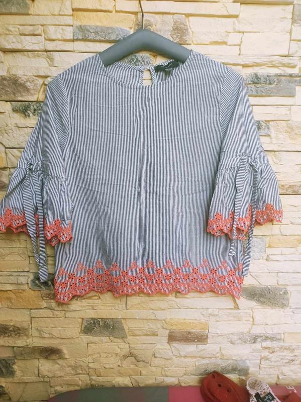 Блуза/топ Primark .вільного фасону,оздоблена гарною вишивкою рішельє ,,бавовна,в оригіналі виглядає краще,ніж на фото,розмір 48-50, стан ідеальний, без дефектів, Заміри : ПОГ 50 см, довжина по спинці 57 см,плечі 38 см.