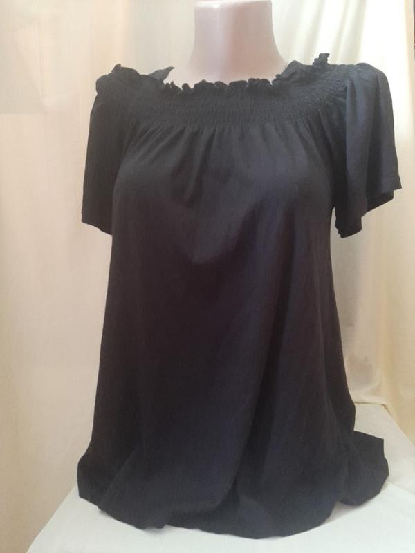 Блуза черная, натуральный состав, плечики на резинке, несколько вариантов в носке. размер UK 12: ПОГ - 50 и тянется до 60, ПОТ - 60+ Длина - 72см, рукав - 21см