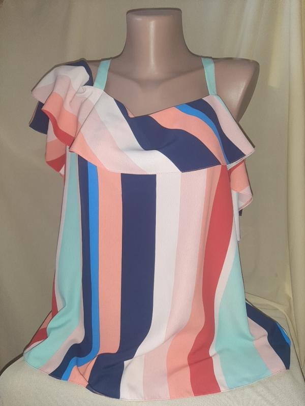 Блуза яркая в полоску разноцветная, состояние новой вещи, несколько вариантов носки плечиков, размер UK 16 : ПОГ - 56, ПОТ - 56, длина - 64, двойная рюша рукав -16 cм