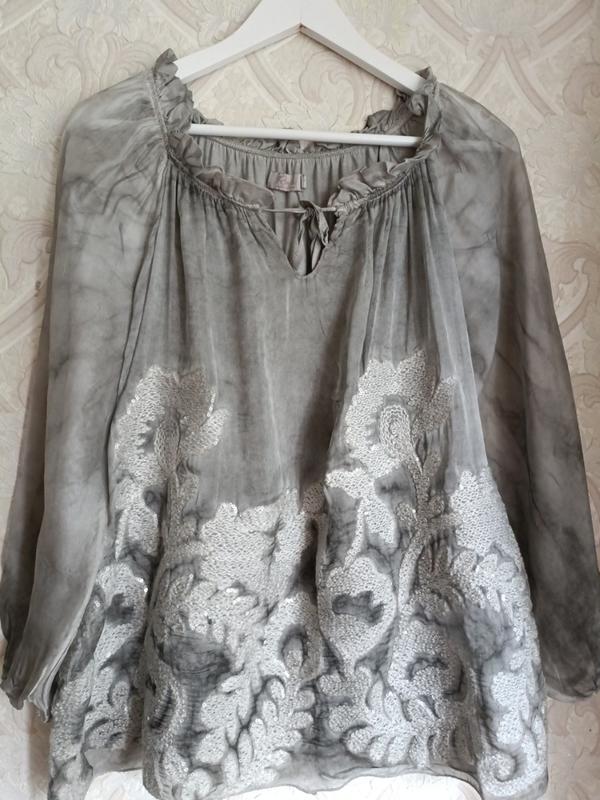 Хорошая блуза, изготовленная в Италии, на подкладке, Перед вышитый пайетками. Замеры: пог 58, длина рукава 59, длина по спине 63. Состав: 70 вискоза, 30 шелк