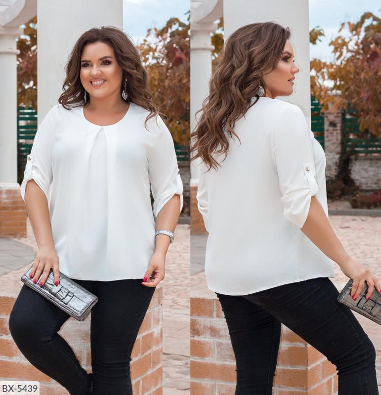 Блуза BX-5439 №1162 Размеры: 50-52 Колір: Білий, Рожевий, Електрик, синій. Тканина Маямі (не просвічується). Довжина виробу 70 см, рукав - 45 см.стильна блузка з оригінальною збіркою на грудях і хлястиком на рукаві. Перед з декоративними складками в області горловини. Горловина круглої форми.