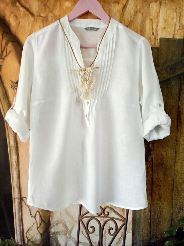 📮Белоснежная льняная блуза. Планка с пуговицами и шлевки на рукавах отделаны кружевом. Рукав 3/4, подкатывается. Идеальное состояние.Красочная маечка в продаже отдельно, просто показала как можно дополнить образ. Замеры : плечи 39 см,ног 51 см, рукав 44 см, длина 66 см.