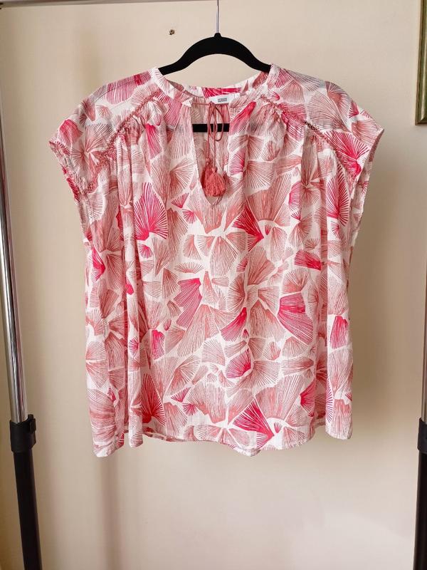 Блуза на короткий рукав в графический принт премиального немецкого бренда. Стан - идеальный новой вещи. Размер M - L. Замеры: ширина по груди - 68 см; ширина по низу - 80 см; длина рукава от шеи - 21 см; длина изделия по спине - 60 см. Состав: 100% хлопок. Рекомендуемый уход: стирка и глажка при низкой температуре.