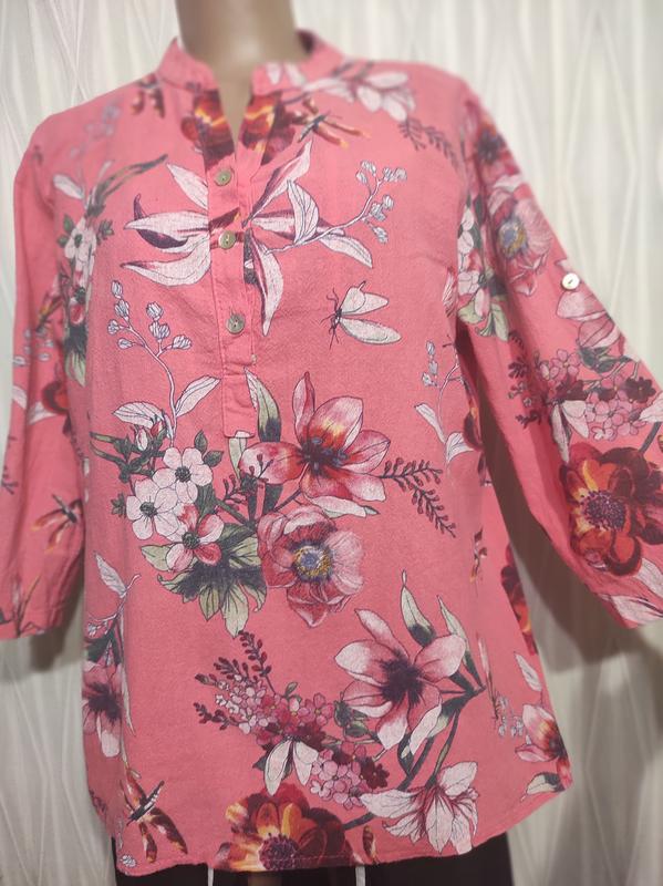 Блуза из хлопка, бирка с составом срезана, но это хлопок, не тянется, рукав подворачивается. Длина от плеча 70см.+- П/о груди подмышки 60см.+- П/о талия 57-58см. П/о бедра 61-63см. Длина рукава 45см.+- Без нюансов.