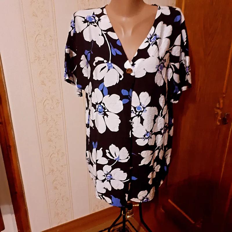 Брендовая блуза натуральная ткань вискоза жатка с красивым цветочным принтом с виобразным вырезом с украшением пуговки под золото!рекомендую!Дл.75 Плечи в рукаве Р 33 от горловины Б по 20 Ог-Об 114см!
