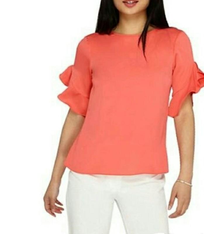У відмінному стані. Тканина приємна на дотик,трикотаж . Тягнеться . Модні рукава 3/4, подвійний волан. Довжина виробу 56см, плечі опущені 68см, пог 55-65 см, низ 50-60 див. Колір корал.