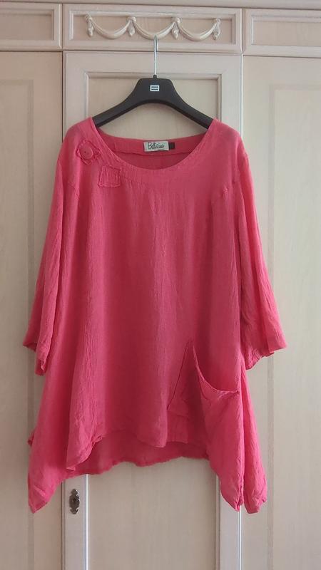 Ткань жатая. Бирочка с составом отсутствует. Похоже на лен с добавками. ПОГ 63 см. Пот 60 см. ПОБ 81 см+.Плечи 46см. Рукав 44см(можно подвернуть). Длина по центру спинки 75 см. По бокам от середины плеча 84 см.