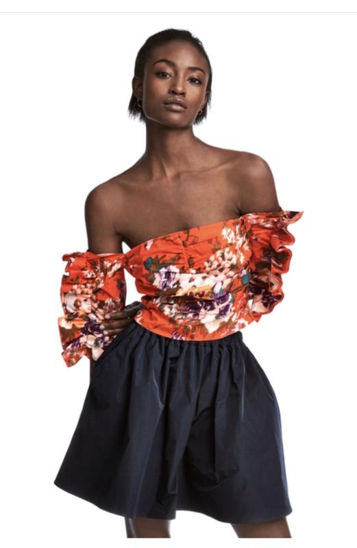 Короткая блуза из хлопковой ткани с цветочным принтом бренда H&M Открытые плечи и короткие рукава с воланами. Сбитый шов спереди и заметная молния сзади. Стан - идеальный Размер: S