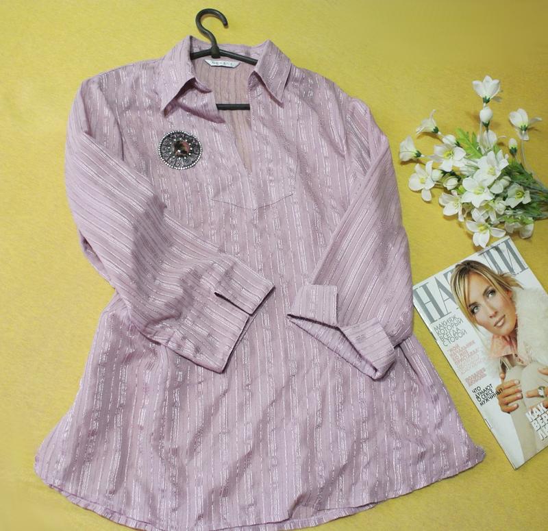 Комфортная лёгкая летняя блуза с рукавом 3/4 сиреневого цвета. Размер 54 (Европейский 48) Сбоку - скрытая застёжка молния для удобства при одевании. Без дефектов и пятен. Причина продажи - уже не мой размер.