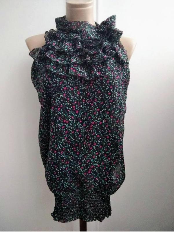 Прекрасная, универсальная блуза, спереди на подкладке. Спереди до линии груди 5 рядов воланов в виде жабо. Закрывается вокруг горла сбоку. Низ на встроченных гумках. Бирки срезаны. Ориентируйтесь на замеры: Полуобхват груди 51см (тянется до 55см), Полуобхват талии 52см, Полуобхват стегон 39см (тягнеться до 64см), Длина изделия 65см. Бутылочка, дырочек нет. Состав : 100% полиэстер. Впереди не осветляется (на подкладке), сзади осветляется.