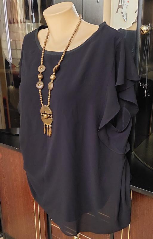 Черная шифоновая блузка без рукавов с рюшей, которая прикрывает плечо. Италия. Нижняя майка вискоза, верх креп-шифон. Смотрите мерки пог-63 поб-70 длина 73 рюша ширина от плеча 11 см