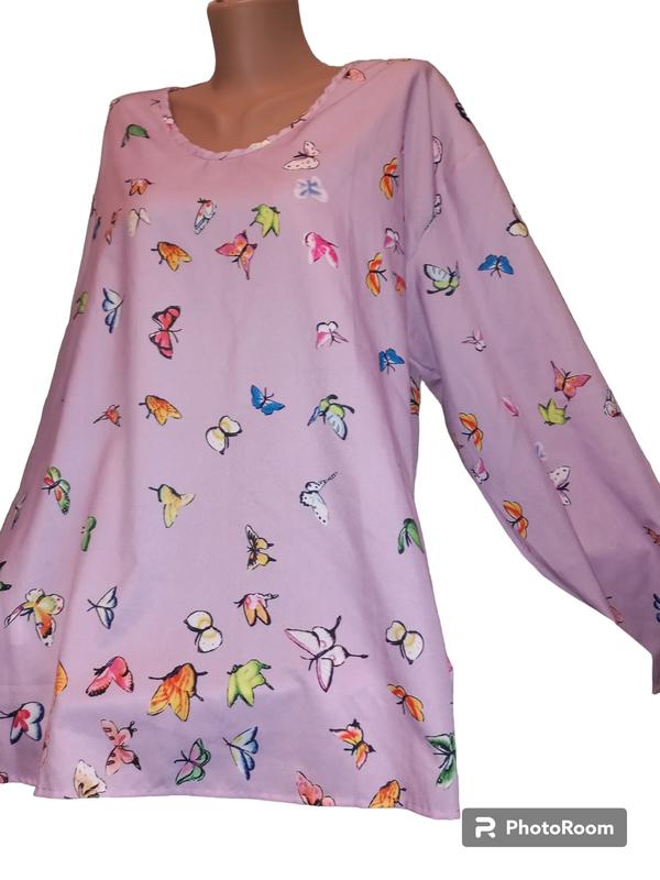 блуза з довгим рукавом Метелики 62-64р, указаний розмір 5 XL, Б/В, у відмінному стані, тканина - шовковистий поліестер - не тягнеться, китайці написали, що у складі є котон - але це китайський жарт))) ПОГ - 67см, ПОС - 77см, рукав - 58см, довжина - 76см