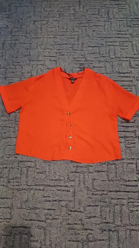 блуза свободного кроя. в насыщенном красном цвете короткий рукав акцентные пуговицы красиво и сама надевать и на маечке тоже красиво. размер 12