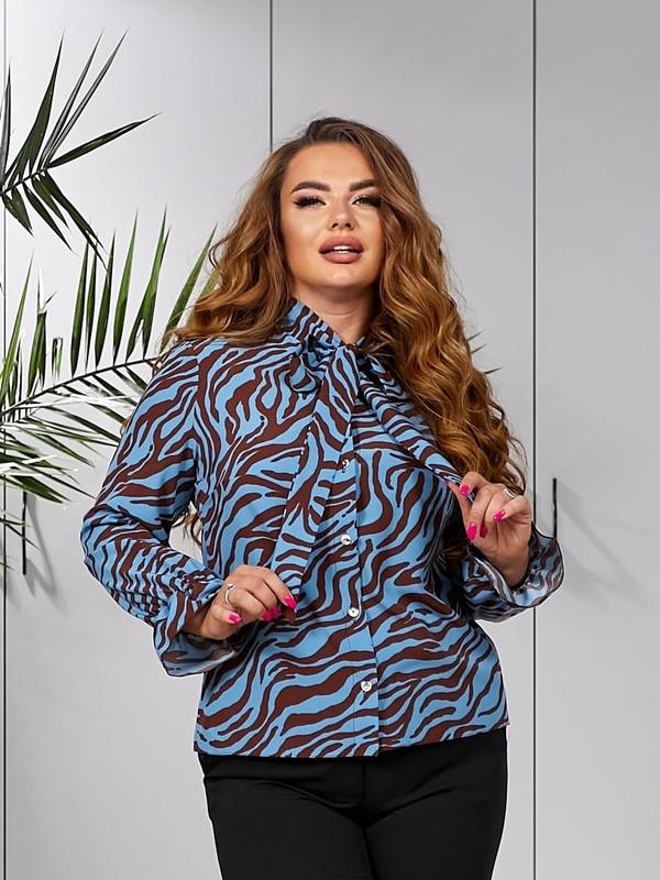Блуза Мод: 503 Изысканная блуза с галстуком, застегивается на пуговицы по всей длине, рукав заканчивается резинкой Тканина: софт Размер: 48-50, 52-54, 56-58, 60-62 Цвета: джинс с черным, капучино с черным, голубый с коричневым Цена 1000грн Категория: Блузки