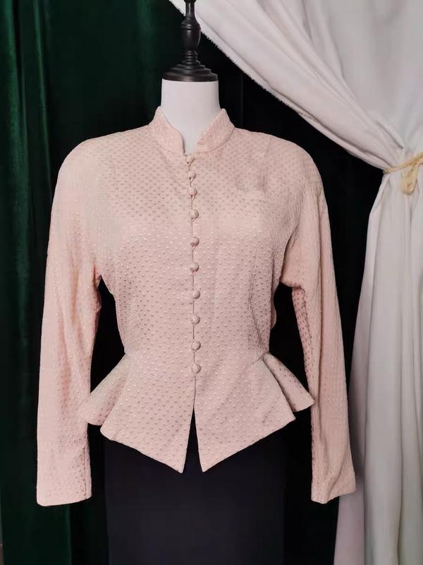 Вінтажний блейзер/кардинал від японського бренду Petit Anne 50-70х років ХХ ст. Приємного пудрового кольору. Є плечики. Розмір С-М. 90 см ОГ, до 72 в талії. Довжина речі 53 см.