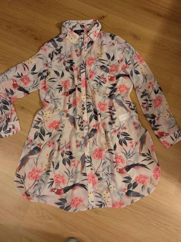 Яркая длинная рубашка/туника New Look с красивым принтом,ткань-шифон, фасон свободный,по бокам глубокие разрезы,перед укороченный, спинка длиннее,размер 48-50,замеры :длина по спинке 95 см,длина переда 86 см,длина рукава 62 см,плечи 39 см,ПОГ 57 см.