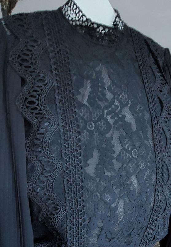 Блуза з мережива Reservd чорного кольору з об’ємними гофрованими рукавами. Мереживна блуза допоможе надати жіночності та елегантності вашим базовим класичним образам. Має гофрований широкий довгий рукав, невеликий мереживний комір-стійку, який застібається на блискавку, на підкладці. Цю блузу ви зможете стильно поєднати з джинсами, брюками з високою посадкою чи зі шкіряною юбкою-олівцем та лаконічними аксесуарами (сумочка, туфлі). Розмір М Заміри Пів обхвату грудей - 44 см Довжина по спинці – 51 см Довжина рукава – 62 см