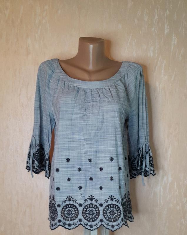 Отличная коттоновая блуза с элементами вышивки, ткань приятная на ощупь, почти невесомая, комфортная, идеально дополняет джинсовые вещи, размер 44-48