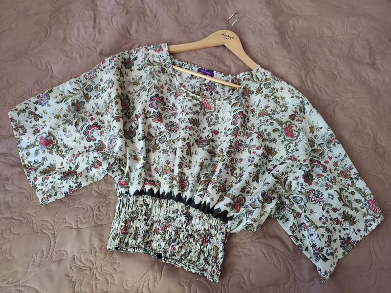 Женская блуза с ярким и оригинальным цветочным принтом. Свободный рукав "летучая мышь". 100% шелк, поэтому не парит и очень приятная к коже, производство Индия. Оттенок между песочным и белым