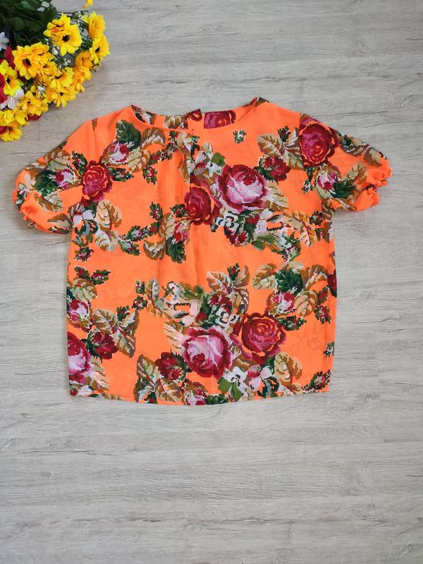 Состояние отлично! Сзади на пуговицах, рукава на резинке. Яскрава. Размера нет, одевалась на 46-48