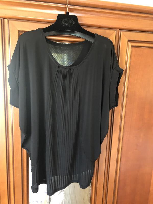 Блуза черного цвета украшена драпировкой Длина плеча 22 Длина по спине 66 Полуокружность по бёдрам 50 ( тянется до 58) Полиэстер