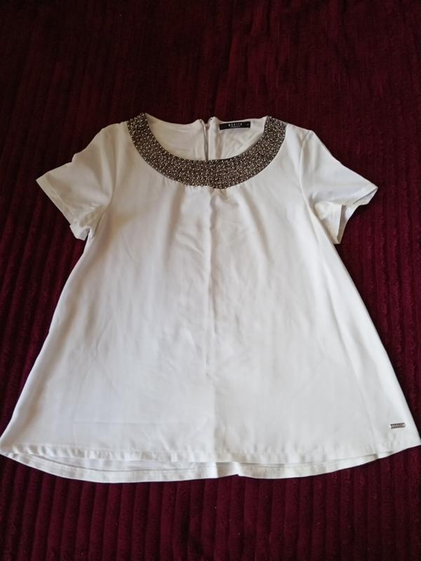 красиво украшенный ворот, спереди шифон сзади мягкая ткань, она не облегающая, подойдет на 42-44