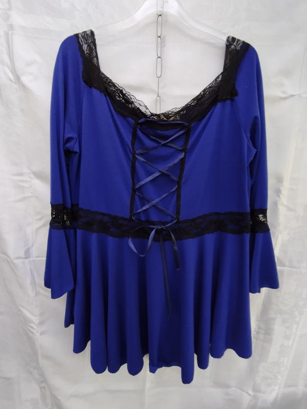 Пол о.г.-,58 длина рукава - 59 пол об.бицепс- 20 пол о.т.-56 длина - 80 Нарядная блуза, ткань трикотаж (футболках).Выкот каре, украшено кружевом.Рукава втачные,низ валан.Нижче талии - валан солнце клеш.Блуза красивого насыщенного цвета - василька.