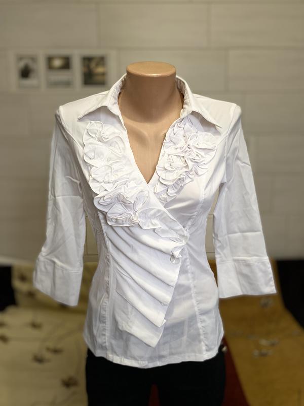 Тканина добре тягнеться, дуже гарна і цікава модель, на запах на завʼязці,зпереду на ґудзиках Розмір xl ПОГ 80 Пот 74 Довжина по спині 60 Довжина рукава 42