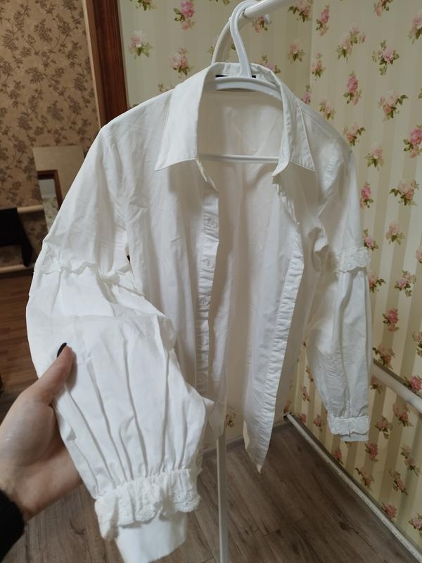 Блуза с красивыми объемными рукавами, отделанными кружевом. Лучше сядет на размер S-M. Универсальный вариант как на каждый день, так и на праздник.