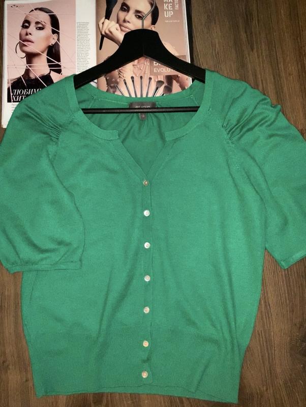 Оригінальна трикотажна кофточка французького бренду “et vous” насиченого смарагдового кольору. Трикотаж мʼякий, приємний до тіла, в складі віскоза, кашемір. Натуральні перламутрові ґудзики, які виготовляються з перлинних раковин. В ідеальному стані. Розмір М, чудово підійде на S. Заміри: ПО плечі 45 ПОГ 45 Довжина 55. Тягнеться