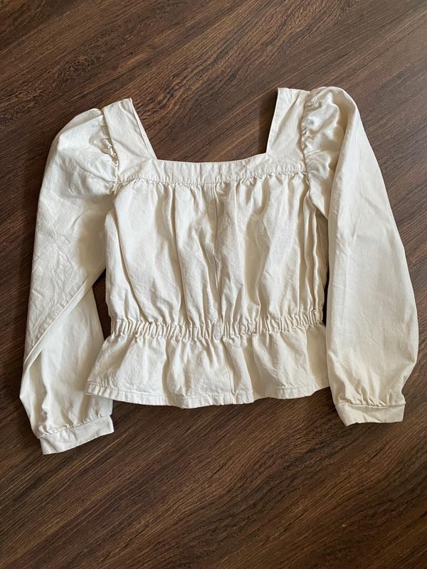 Блуза из бежевого джинса, довольно плотного. Длина 56 см, рукав 62, по плачам 36 (можно на более широкие плечи ща счет рукава буф), по талии рединка 36, тянется до 55, по груди 50