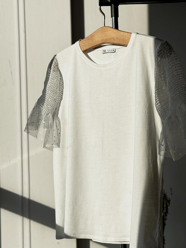 Пышные кружевные рукава добавляют модный акцент на базовую вещь, делая её идеальной для повседневного и нарядного образа. Размер на бирке: L. Замеры изделия: - обхват талии: 52 см - ширина спинки: 41 см - длина спинки: 60 см - длина рукава: 25 см