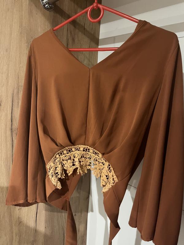 Эта блузка смотрится очень женственно и стильно. Ее можно носить как с джинсами, так и с юбкой.очень насыщенный коричневый цвет, сзади можно завязывать, подчеркивает талию ☺️