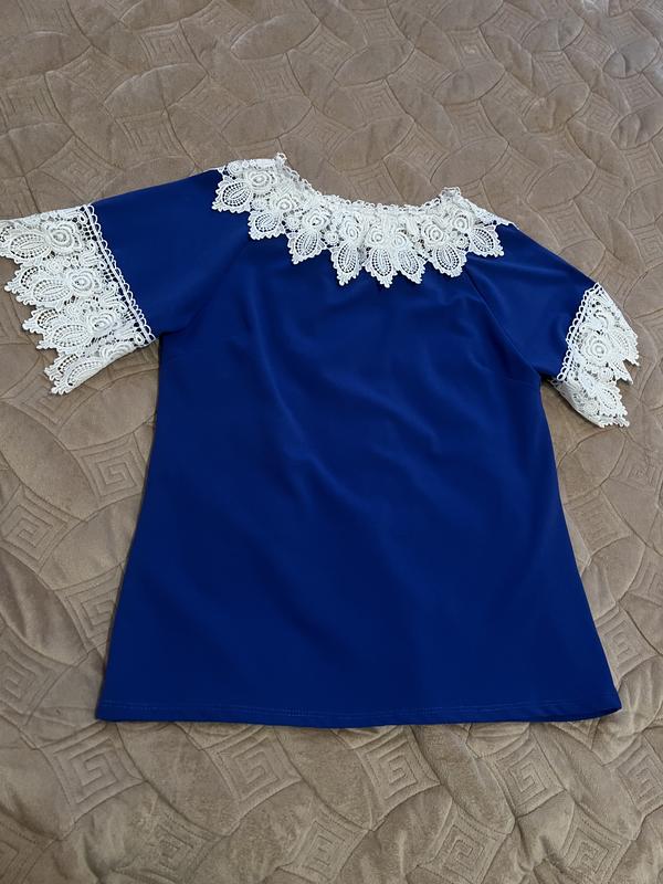 Синяя блузка с кружевом Плечи - 42-44 (на резинке) ОГ - 50 Длина от плеча - 59