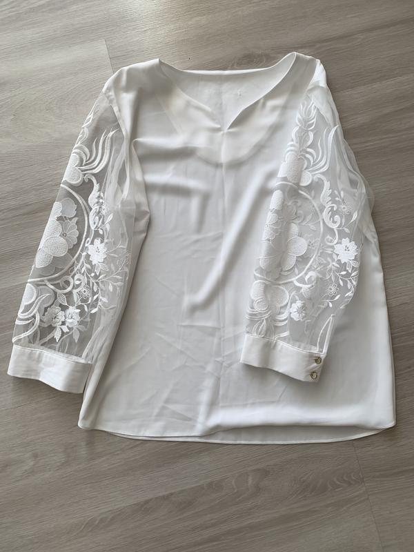 Красивая белая блузка с ажурными рукавами,стан новой,длина по спине 66,ширина 52,5,рукав 49,5