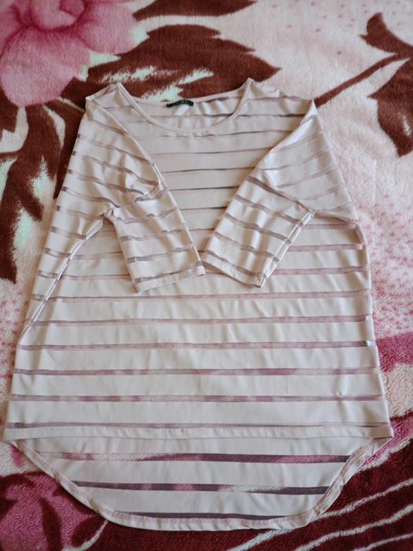 Блуза в оригинальном стиле. Рукав 3/4. Спинка удлиненная с полукруглым вырезом. Плечи 54 см, грудь 60 см. длина сп. 70 см., перед 51 см.