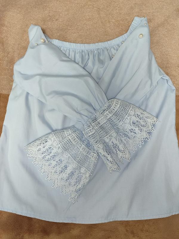 Блузка голубая, в отличном состоянии длина изделия - 50см ширина - 50см длина по внутреннему шву - 36см рукава в три четверти, имеют кружево жемчужинки хорошо держатся резинка не давит и красиво держит