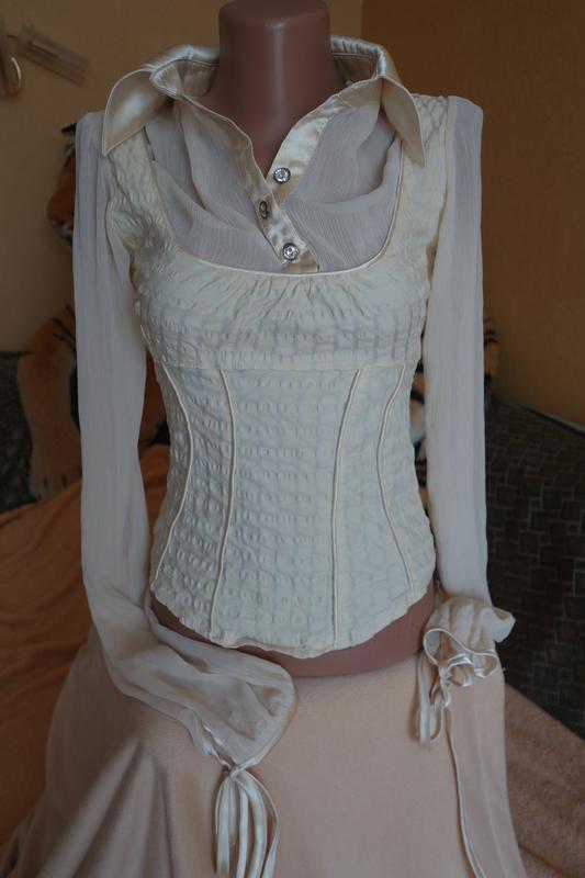 Безумно красивая и оригинальная комбинированная блузочка. Ткань жатка шифон и типа нежного и мягкого спандекса, который очень хорошо тянется. По низу рукавов атласная лента. Очень выгодно подчеркивает грудь шов под ней и шифоновая вставка на пуговичках. Цвет шампань. Плечи 38см, длина 52см, ПОГ 36см, длина рукава 67см. Смотрите другие мои предложения)))