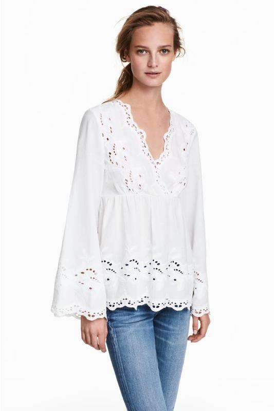 Блузка в воздушном хлопчатобумажном плетении с broderie anglaise. V-образный вырез и передняя панель с длинными, широкими трубными рукавами. Шов на талии со сбоками и бликами к краю. Размер 16 СОСТАВ Хлопок 100%