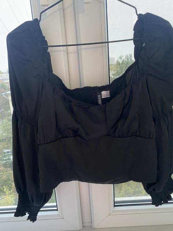 Укороченная блуза черного цвета, на спинке резинка, хорошо тянется, рукав длинный размер Л